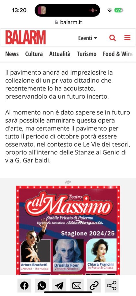 La collezione delle Stanze al Genio, già rinomata per essere tra le più vaste e preziose al mondo nel suo genere, si arricchisce continuamente di storie e di capolavori che superano i confini regionali. Il viaggio di uno di questi tesori, in particolare, ha catturato l’attenzione, con il portale Balarm che gli ha dedicato un approfondimento: Nasce a Napoli ma lo ammiri a Palermo: nelle Stanze del Genio “cammini” sulla storia. Puoi leggere l’articolo completo sul loro sito cliccando qui.